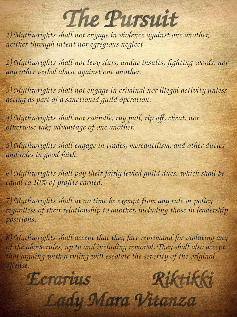 Profit cannot be achieved consistently through chaos or selfishness. While there is a time and a place for such risks, consistently gambling on luck and fate merely allows coin to slip through your fingers, either in the present or in the future. Thus, guiding principles must be enforced to ensure the Mythwrights work together for the benefit of all.